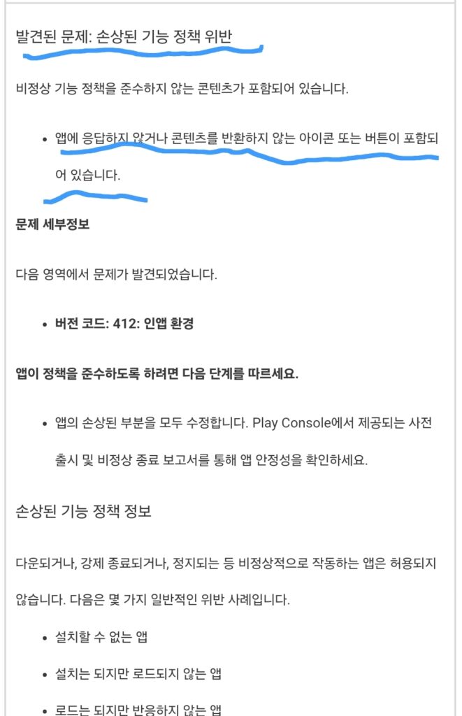 구글플레이 스토어에 앱 업데이트가 거부되었다. 거부사유는 손상된 기능 정책 위반이란다. 앱에 응답하지 않거나 준수하지 않는 콘텐츠가 포함되어 있습니다.