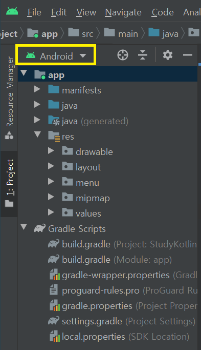 1. 안드로이드 스튜디오를 실행 후 프로젝트를 생성하거나 기존 프로젝트를 엽니다. 콤보박스에서Android을 선택합니다.