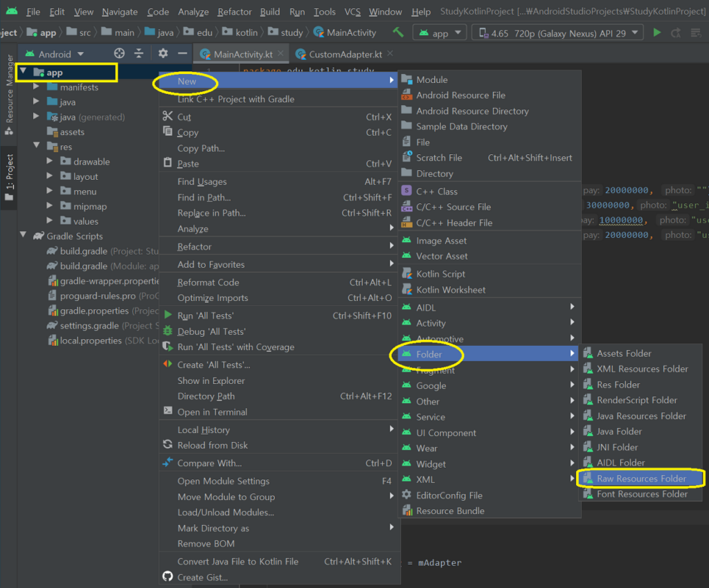 2. app폴더를 마우스 오른쪽 버튼으로 클릭하면 팝업 메뉴가 나타납니다. New > Folder > Raw Resource Folder 메뉴를 클릭합니다.