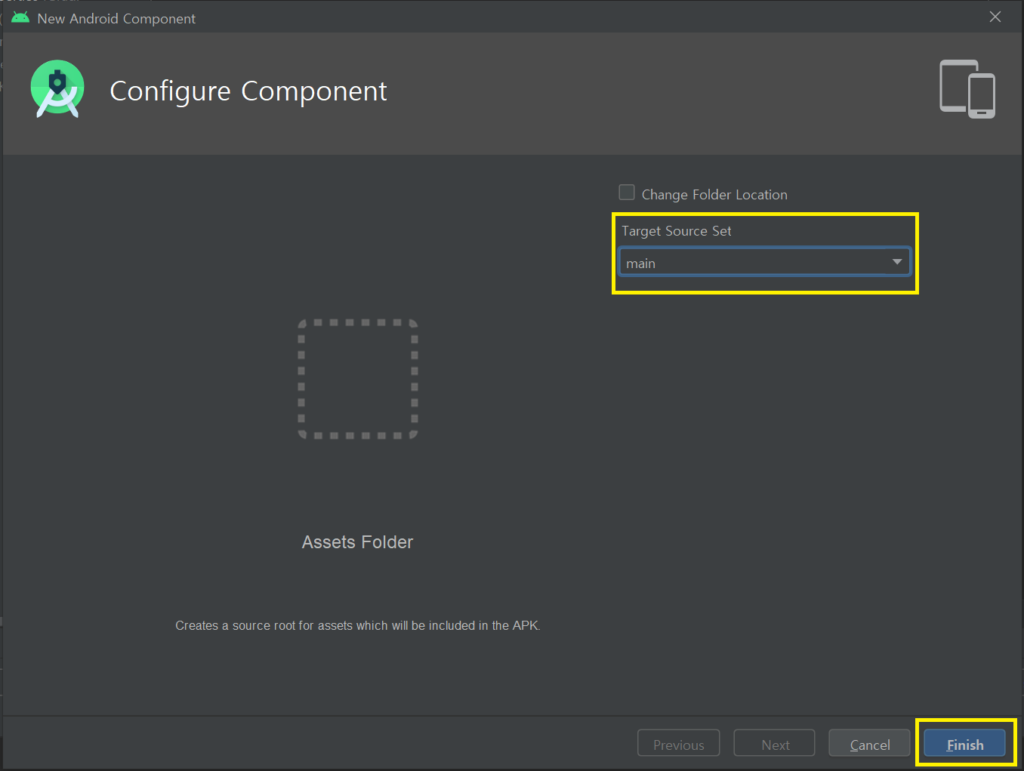 3. 대화상자가 열리면 Tart Source Set 값으로 main를 선택합니다. (기본값 유지) 그리고 Finish버튼을 클릭하면 생성이 완료됩니다.