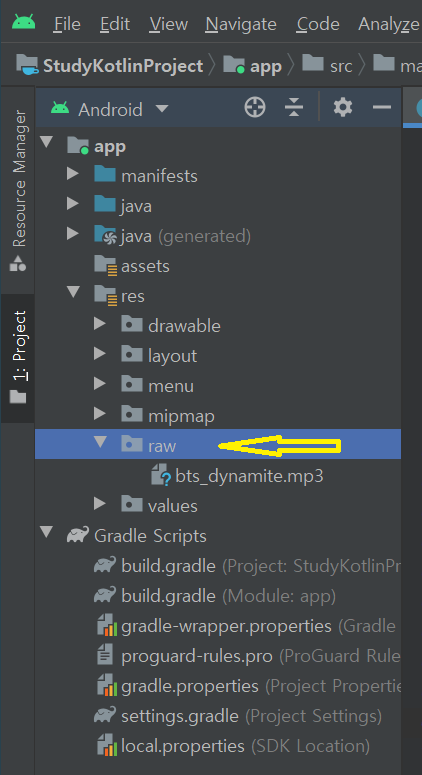 앱에 오디오 파일(mp3)파일을 추가 후 재생하기 위해서는 raw폴더(리소스 폴더) 를 생성해야 합니다. raw폴더는 main폴더 아래에 생성해야합니다. 직접 main폴더를 열고 raw폴더를 생성하면 간단하게 해결 됩니다. (src/main/raw/)