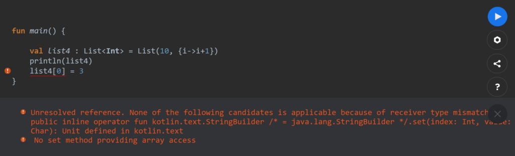 읽기 전용 타입이기 때문에 값을 변경하려고 할 때 오류가 발생된다. 값을 변경하고자 할 경우에는 MutableList, ArrayList를 사용하면 된다. 그러나 val로 선언한다면 값을 변경할 수 없으니 참고 하자.