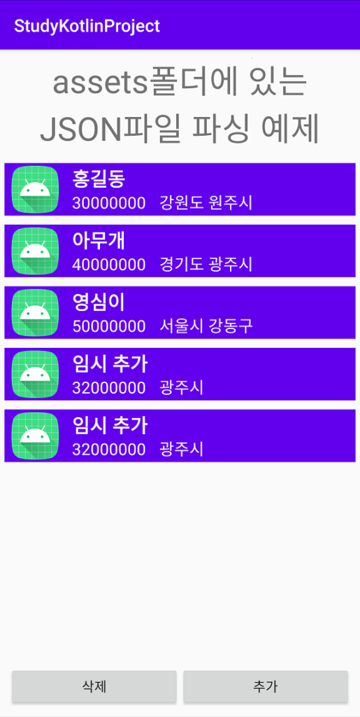 [android : kotlin] 코틀린 JSON 객체 파싱하는 방법 및 RecyclerView 아이템 추가 및 삭제방법 : Assets폴더 내에 json파일 파싱방법