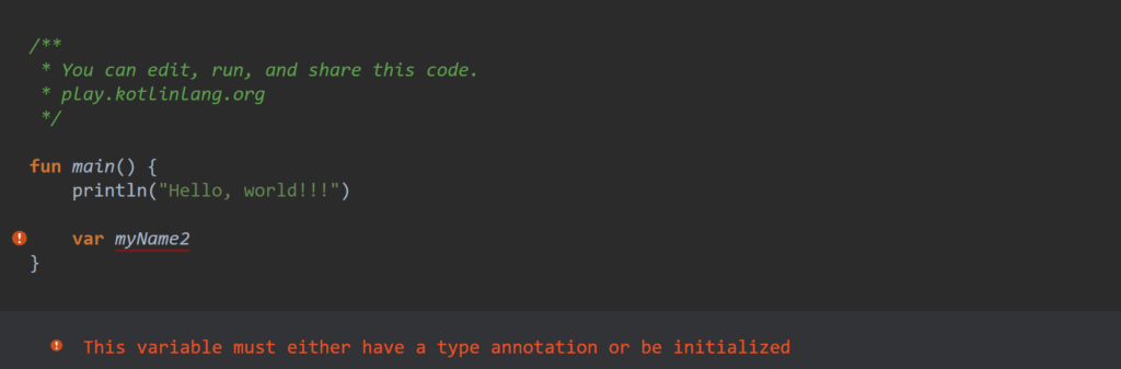 val isNotExist : Boolean // 초기값을 지정하지 않고 선언만 한경우에는 반드시 자료형 (Boolean)을 명시 해야한다.