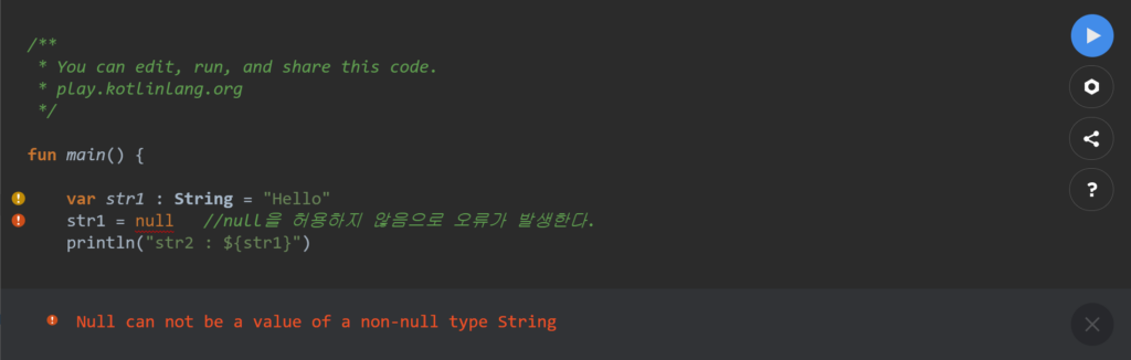 //str1 = null //null을 허용하지 않음으로 오류가 발생한다.