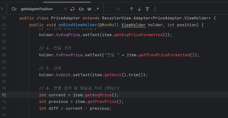 빨간색으로 표시된 클래스(예: item.getAvgPriceFormatted())가 속한 패키지가 실제로 존재하는지, 그리고 import 문이 올바르게 선언되었는지 확인한다.