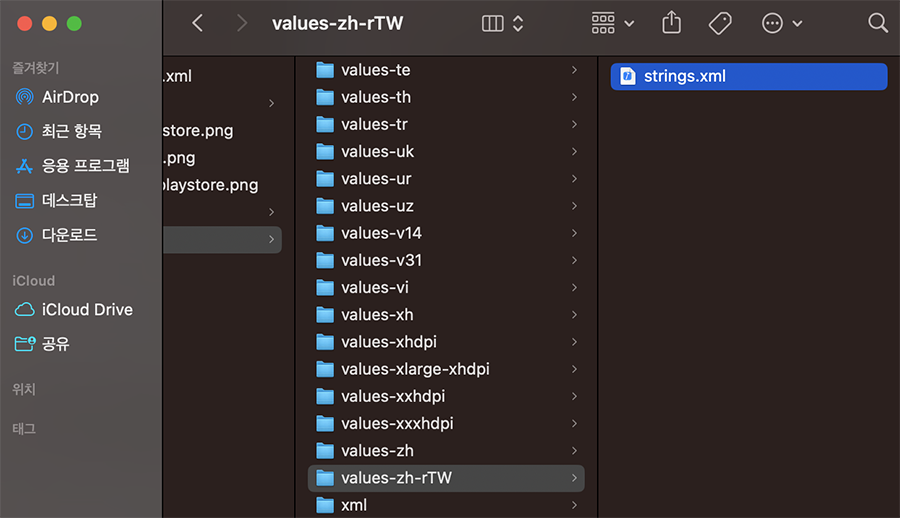참고로, 중국어 언어 리소스에 추가할 strings 파일 이름을 잘 모르겠다면, 아래 설명을 따라서 언어 리소스를 추가해주면된다.