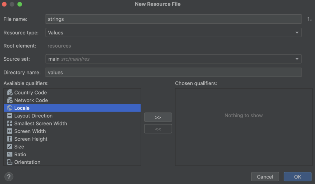 - 다른건 건드리지말고 하단에 Available qualifiers 영역에서 Locale을 클릭 후 ” >>” 버튼을 클릭