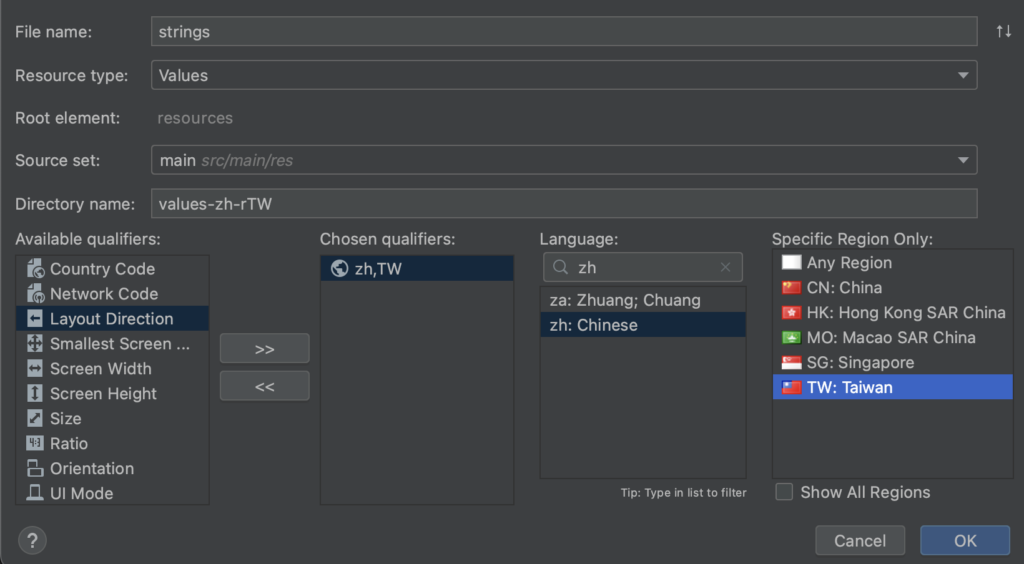 Language 선택창에서 zh로 검색 후 Specific REgion Only 영역에서 TW:타이완을 선택하면 Directory Name이 자동으로 values-zh-rTW로 언어 선택에 따라 변경됨을 확인할 수 있다.