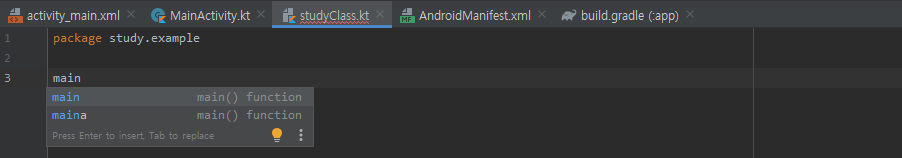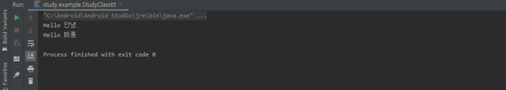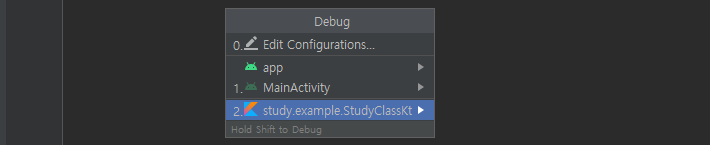 아래와 같은 클래스 선택이 팝업메뉴가 나타난다. 여기서 내가 좀 전에 작성한 StudyClass.kt를 선택하면 실행된다.