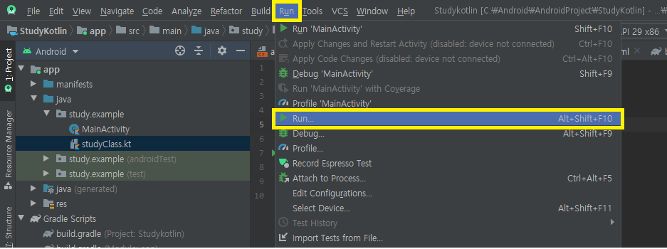 alt + shift + F10 의 단축키를 누르거나 상단 Run메뉴를 선택 후 Run…를 선택한다.