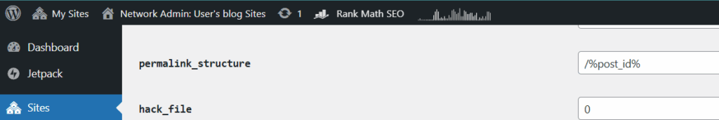 - 사이트 리스트에서 각각 Edit 버튼 클릭 > Setting 탭 클릭 > 블로그 이름과 제일 중요한 permalink_structure를 변경한다. 기존에 검색엔진이 이미 크롤링 해갔음으로, URL 방식이 바뀌면 블로그는 저품질에 빠짐으로 주의해라. 과거에 ssl인증서 갱신할때, www.test.com 트래픽을 test.com으로 유입되도록 해버리는 바람에 낭패를 본 적이 있다.