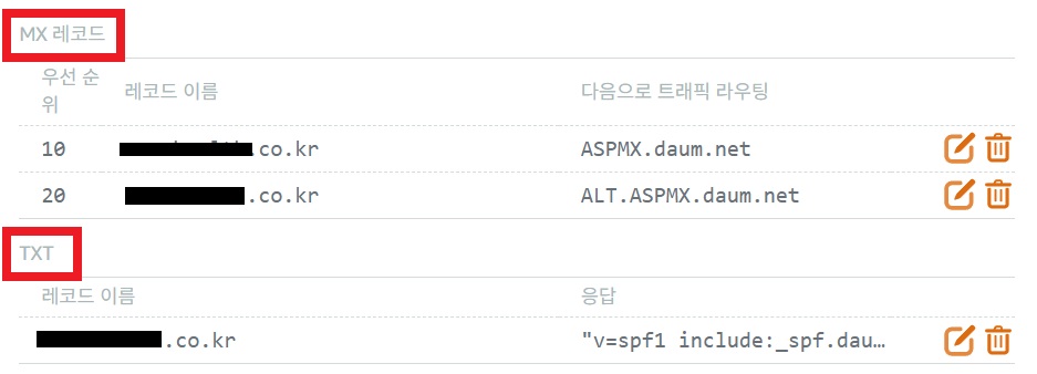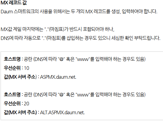 이제 메일이 다음(Daum) 서버로 배달되도록 등록처리가 필요함. 웹사이트 연결(A 레코드)은 건드리지 않으니 안심해도 됨.