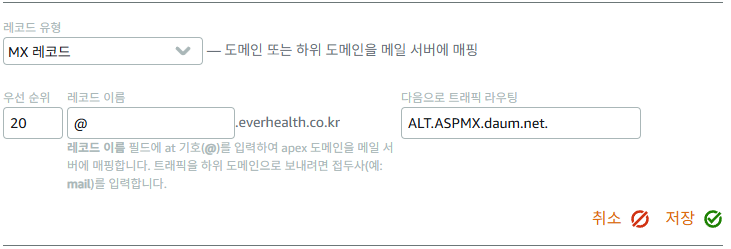 - 다음으로 트래픽 라우팅 -> MX서버 주소 입력