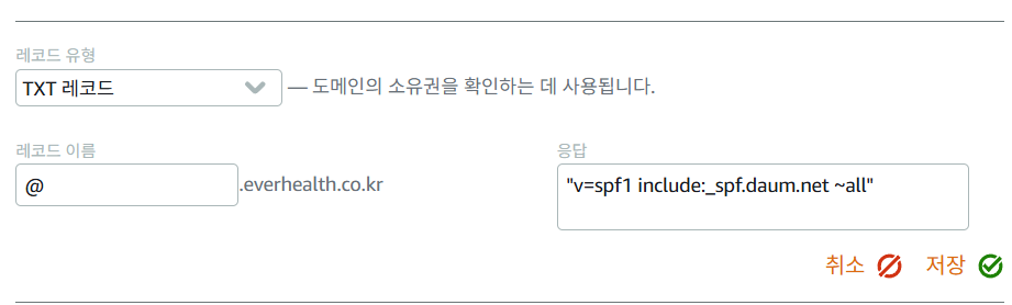 "v=spf1 include:_spf.daum.net ~all" - 주의: 반드시 따옴표(“)를 포함해서 입력해야 함