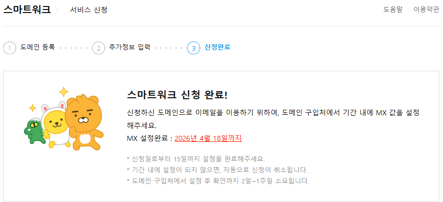 - 방법: Daum 스마트워크 페이지에서 도메인을 등록한 뒤, 도메인(내도메인.co.kr)의 DNS 설정(MX 레코드)만 Daum 서버로 연결해 주면 바로 사용할 수 있어.