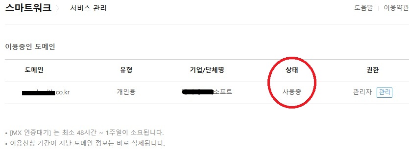- 다시 다음 스마트워크 관리자 페이지로 돌아와서 ‘도메인 소유 확인’ 또는 ‘설정 확인’ 버튼을 클릭. (DNS 정보가 퍼지는 데 5분~1시간 정도 걸릴 수 있다.)