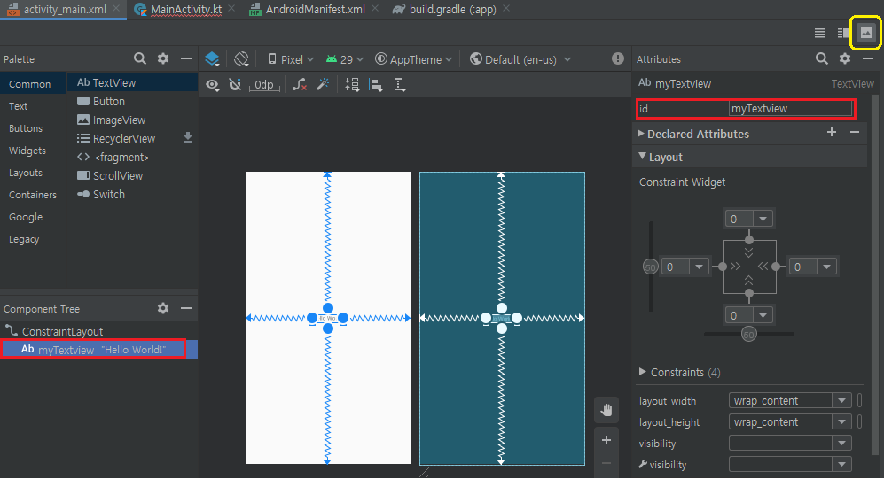 디자인 모드를 클릭 후 왼쪽 하단에 Component Tree에서 TextView를 클릭하면 오른쪽 상단에서 id값을 확인할 수 있다.