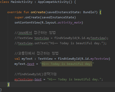 [kotlin]코틀린 findViewById() 사용하는 방법(Java랑 다르다)