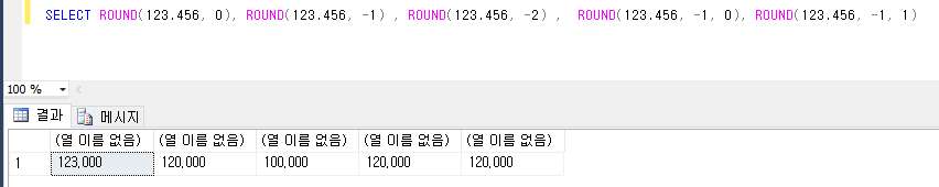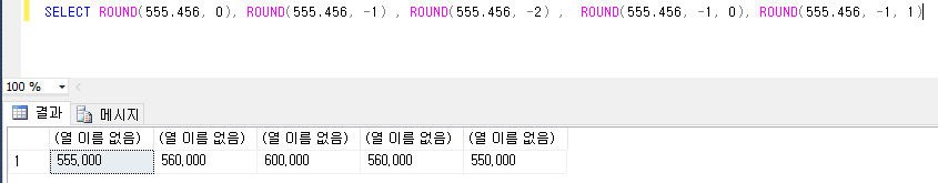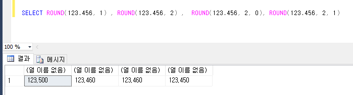 ROUND (대상 값, 반올림 자릿수, 반올림 여부(0은 반올림, 1은 내림))