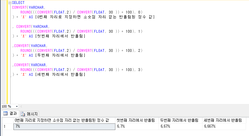 SELECT CONVERT(VARCHAR, ROUND(((CONVERT(FLOAT,2) / CONVERT(FLOAT, 30 )) * 100), 0) ) + '%' AS [0번째 자리로 지정하면 소숫점 자리 없는 반올림된 정수 값] , CONVERT(VARCHAR, ROUND(((CONVERT(FLOAT,2) / CONVERT(FLOAT, 30 )) * 100), 1) ) + '%' AS [첫번째 자리에서 반올림] ,CONVERT(VARCHAR, ROUND(((CONVERT(FLOAT,2) / CONVERT(FLOAT, 30 )) * 100), 2) ) + '%' AS [두번째 자리에서 반올림] ,CONVERT(VARCHAR, ROUND(((CONVERT(FLOAT,2) / CONVERT(FLOAT, 30 )) * 100), 3) ) + '%' AS [세번째 자리에서 반올림]
