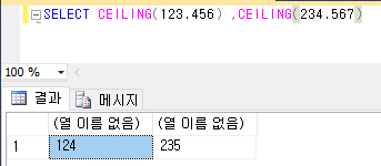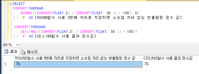 SELECT CONVERT(VARCHAR, ROUND(((CONVERT(FLOAT,2) / CONVERT(FLOAT, 30 )) * 100), 0) ) + '%' AS [ROUND함수 사용 0번째 자리로 지정하면 소숫점 자리 없는 반올림된 정수 값] ,CONVERT(VARCHAR, CEILING(((CONVERT(FLOAT,2) / CONVERT(FLOAT, 30 )) * 100)) ) + '%' AS [CEILING함수 사용 결과 정수값]
