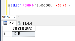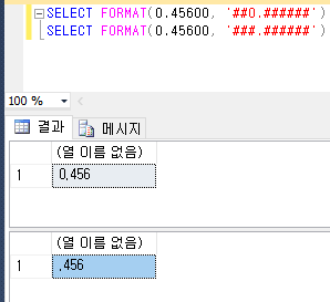 FORMAT(대상값, 자리수) 1) 자리수 만큼 0을 넣을 경우 예) '00000' 2) D뒤에 자리수를 지정하는 경우 예) 'D5'