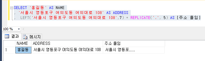 , LEFT('서울시 영등포구 여의도동 여의대로 108',7) + REPLICATE('.', 5) AS [주소 줄임]