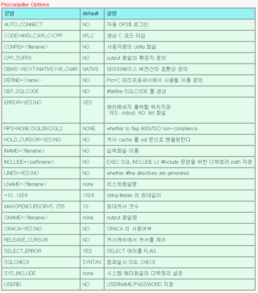 | INCLUDE=<pathname> | NO | EXEC SQL INCLUDE 나 #include 문장을 위한 디렉토리 path 지정 |