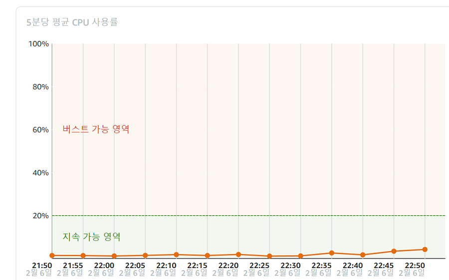 아마존라이트세일 콘솔에 로그인 후 cpu지표를 확인하였다. 지극히 정상이었다. 버스트 영역에는 진입하지도 않았다.