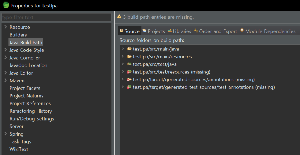 오류 해결을 자바 필드 경로의 source 탭을 보니 소스 경로가 프로젝트 src 경로 하나만 잡혀있는것이 아닌가?