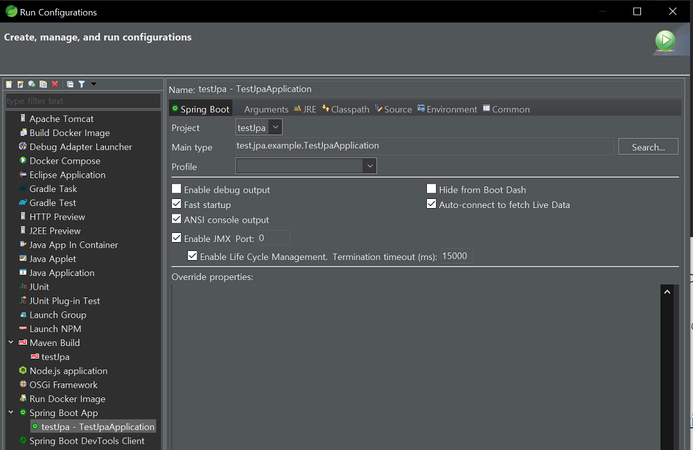 서버를 시작해주면 Run configurations 설정에서 Spring Boot App 아래에 추가해주지 않아도 자동으로 생성된다.
