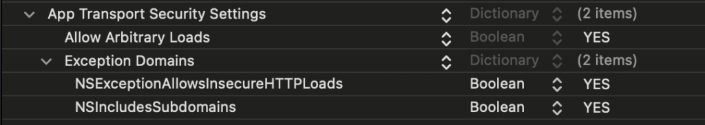 - Exception Domain – NSExceptionAllowsInsecureHTTPLoads 추가, Boolean type, value를 YES 값 설정