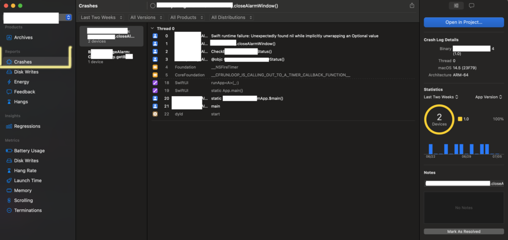 [Xcode] App Store Connect 에는 없는 구글플레이콘솔에는 있는 비정상 종료 (Crashes)및 ANR 정보와 같은 정보를 확인하는 방법