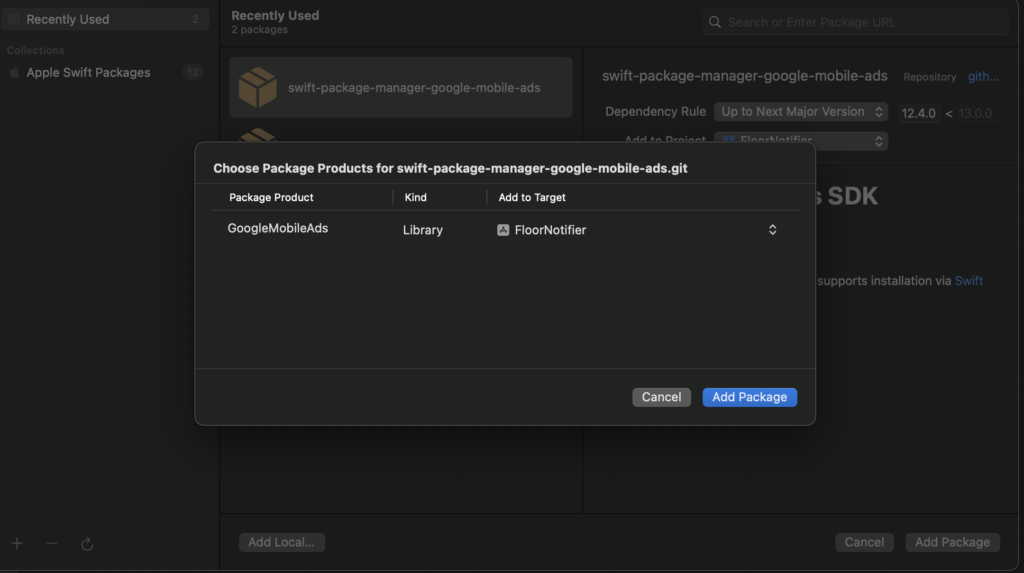 GoogleMobileAds가 Package Dependencies에 보입니다.- 이제