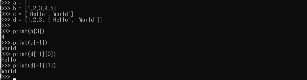 a = [] b = [1,2,3,4,5] c = ['Hello','World'] d = [1,2,3, ['Hello', 'World']]