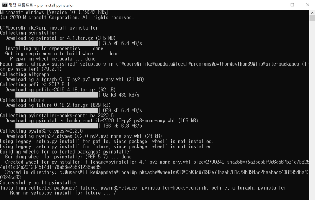 Successfully installed altgraph-0.17 future-0.18.2 pefile-2019.4.18 pyinstaller-4.1 pyinstaller-hooks-contrib-2020.10 pywin32-ctypes-0.2.0